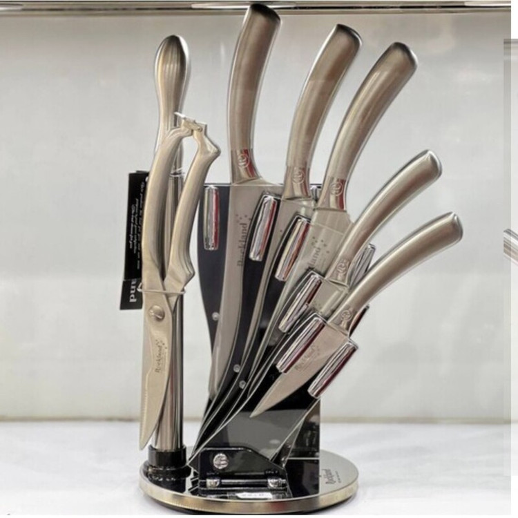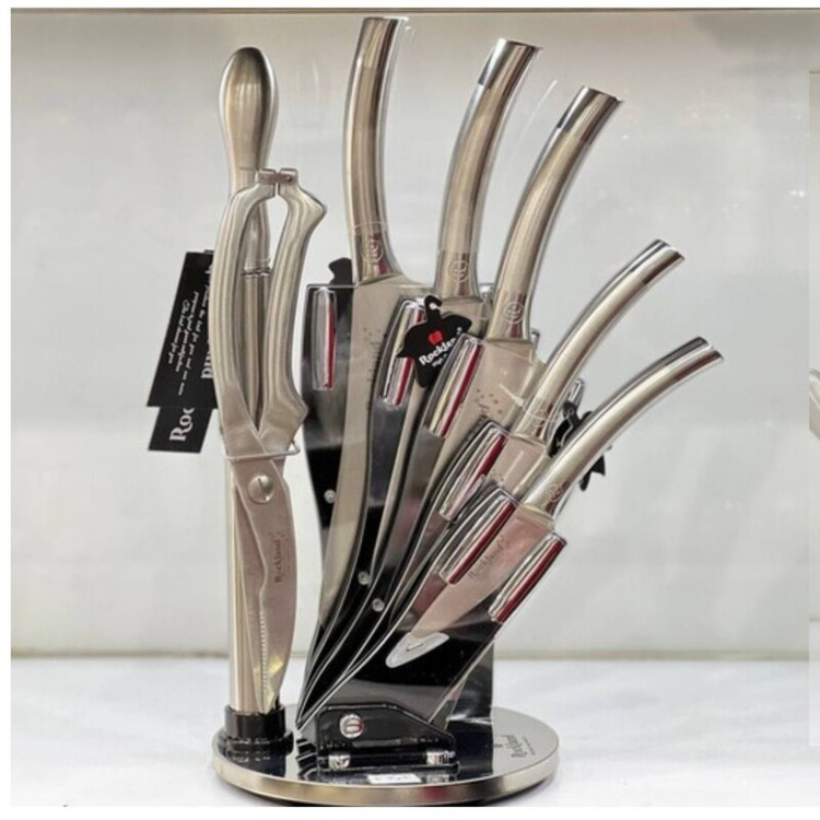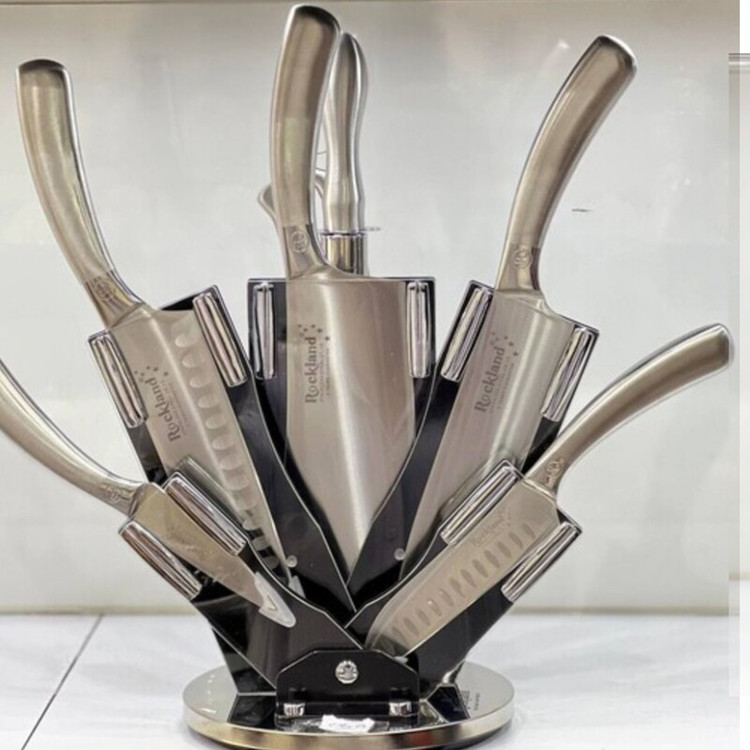 تیغه ی این ست های چاقو بسیار تیز دسته ها بسیار با دوام است با ضمانت در برابر زنگ زدکب و سیاه شدن ضخیم و تیغه و دسته یک تیکه سرویس کارد وساطور راکلند یک ابزار کاربردی برای آشپزی در خانه است که کمک میکند کارها به سریعترین روش ممکن انجام شود. گاهی از خرد کردن پیاز شکایت میکنید و این کار برایتان سخت است، زیرا چاقو شما کند شده بههمین دلیل داشتن یک سرویس کارد و ساطور در آشپزخانه بسیار خوشحالکننده خواهد بود. برای خرد کردن سبزی و سایر مواد غذایی هم این سرویس قابل استفاده است. زیرا با داشتن کارد از جنس فولاد مواد غذایی را به بهترین شکل ممکن خرد میکند. برای استفاده از این وسیله اصلا نیاز نیست که به دست خود فشار وارد کنید. تیغه این چاقو بسیار تیز است دسته چاقو بسیار با دوام و همین طور دارای ضمانت در برابر زنگ زدگی و سیاه شدن است شامل سرویس چاقو حرفه ای 8 پارچه با استند دارای 4 عدد چاقو دارای 1 عدد ساطور دارای 1 عدد قیچی حرفه ای دارای یک عدد چاقو تیز کن دارای برندگی بالا طراحی منحصر به فرد" طراحی آرگونومیک بسیار تیز و بادوام مقاوم در برابر زنگ زدگی