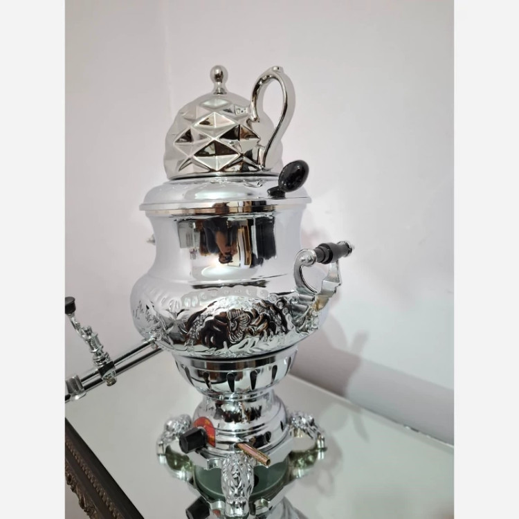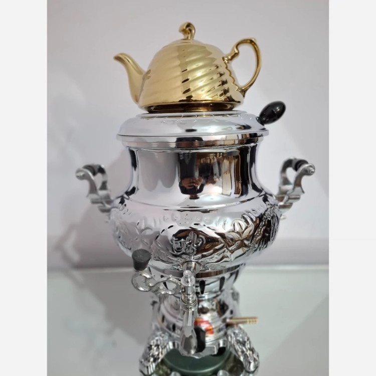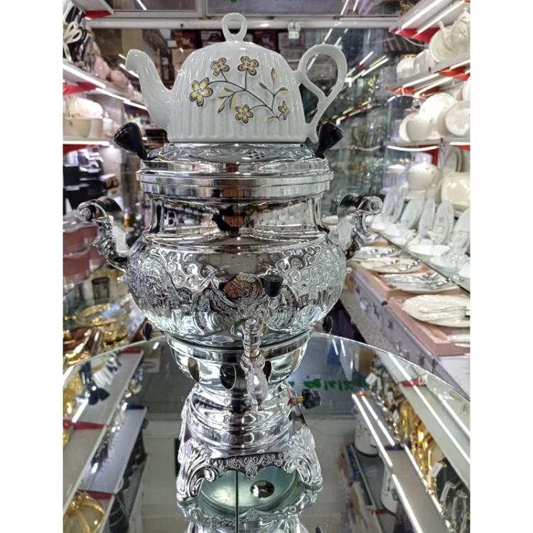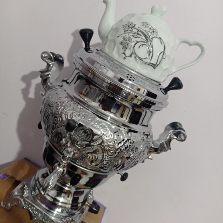 سماور جلایر بدنه برنجی کیفیت بالا 3کاره با قوری چینی قوری ها متغیر هستش و به صورت رندوم ارسال میشه حجم:6لیتر بدنه:قلم کاری جنس تنوره:برنجی 1سال ضمانت