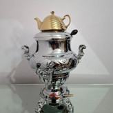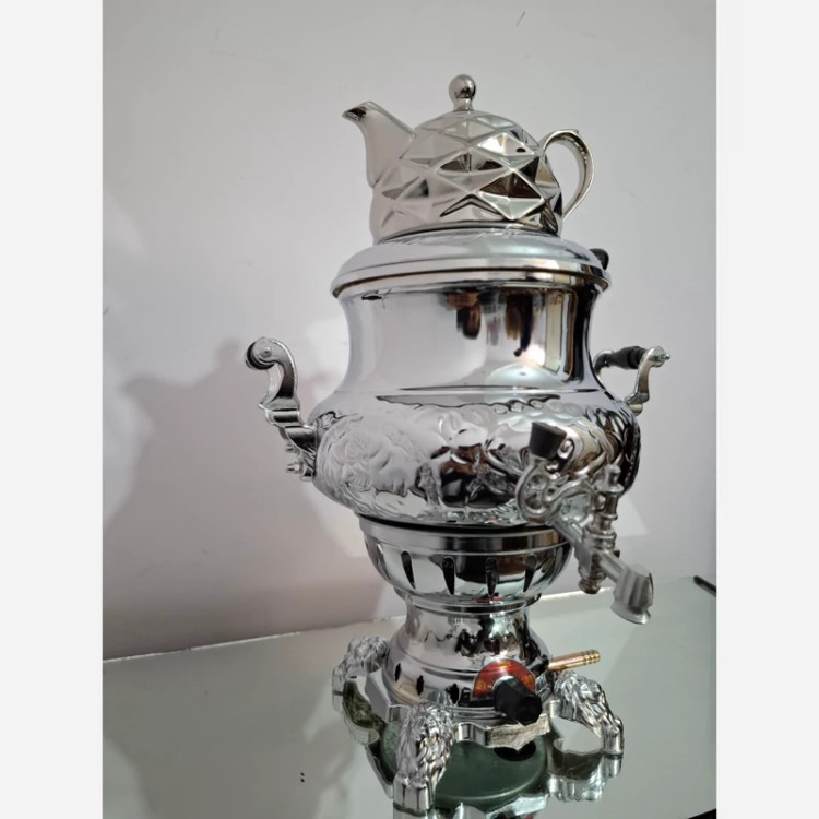 سماور گازی جلایر سه کاره 6 لیتر بدنه برنجی با قوری بدون تنوره (بدنه طرح دار)
