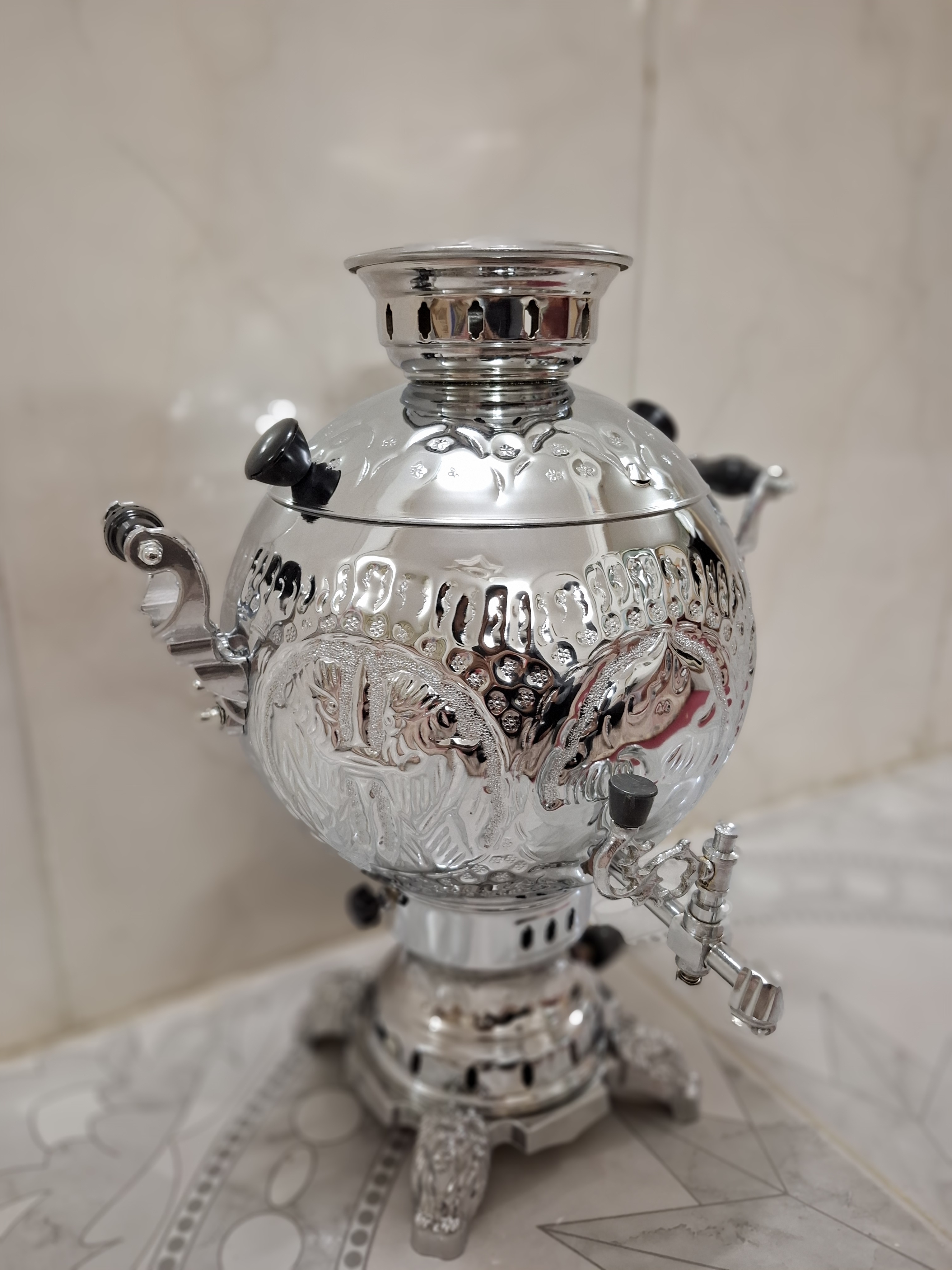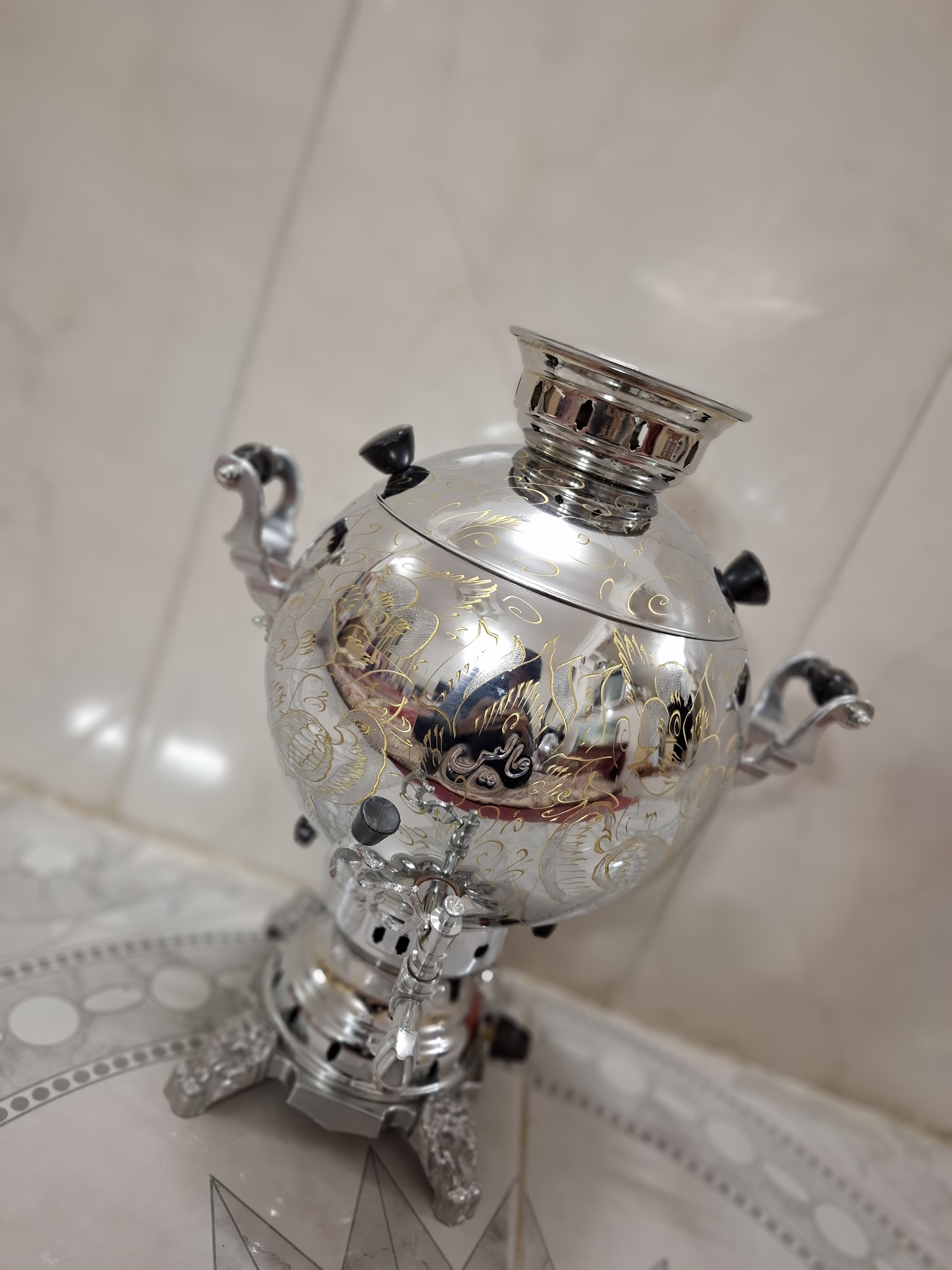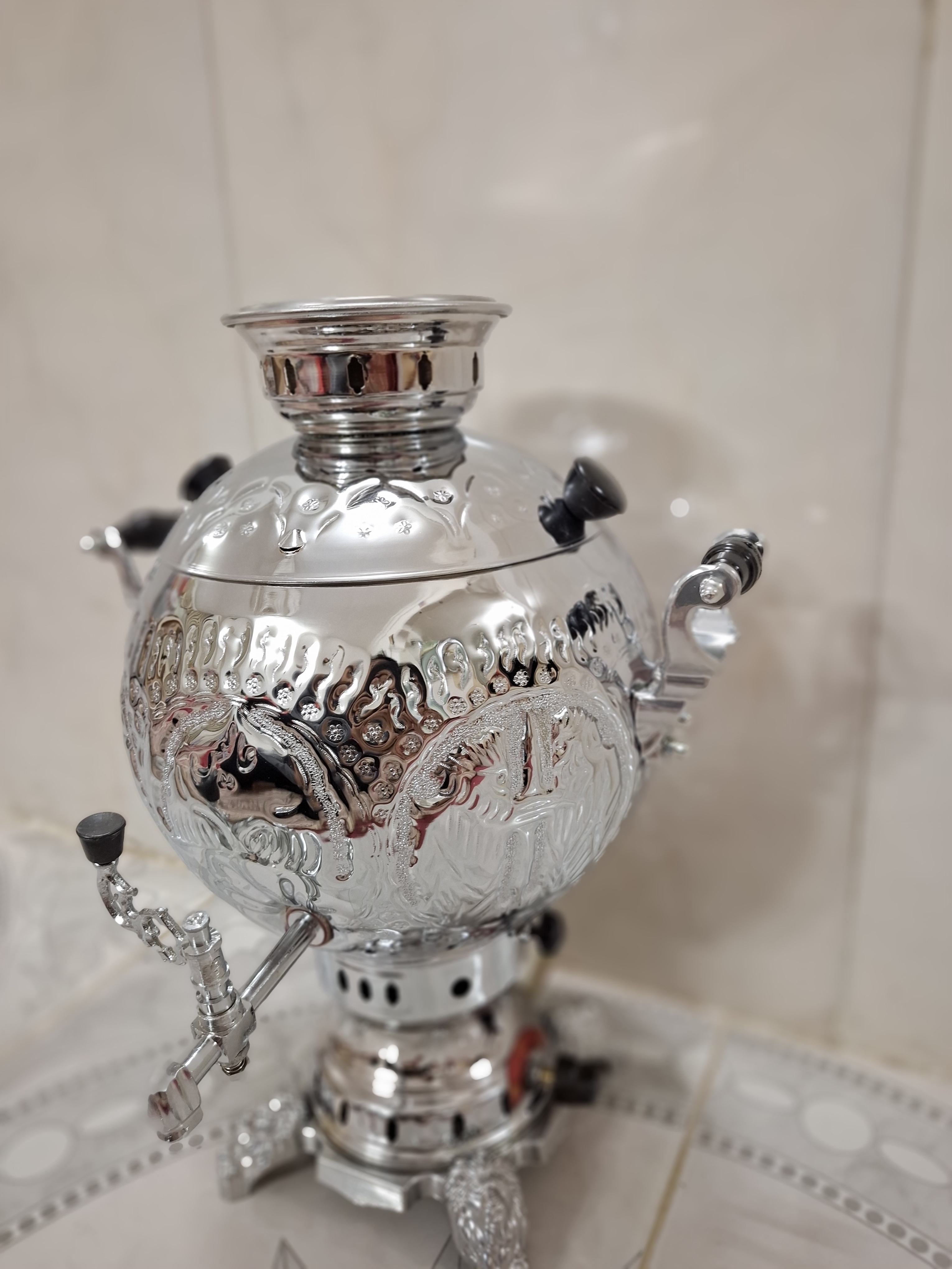 سماور توپی قلم و تراش بدنه برنجی کیفیت بالا تنوره دار حجم:6لیتر بدنه:قلم کاری و تراش جنس تنوره:برنجی 1سال ضمانت