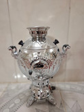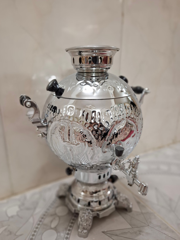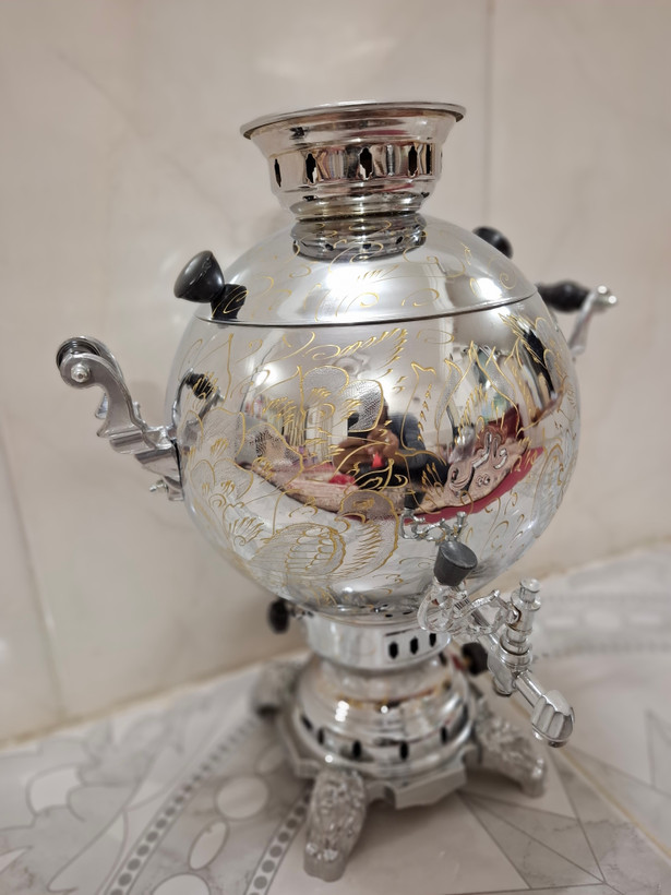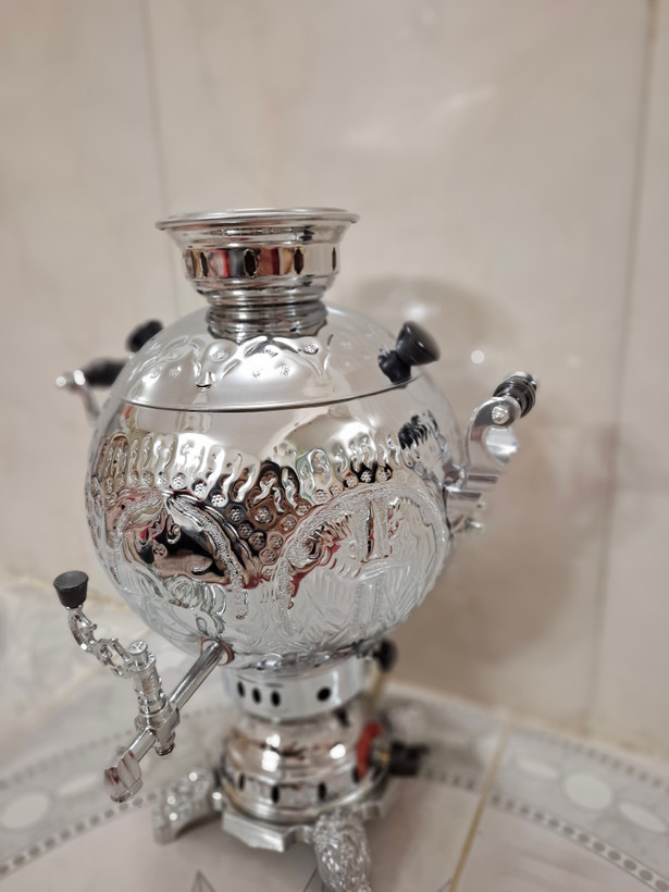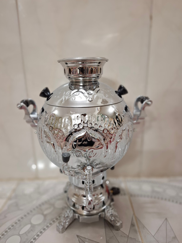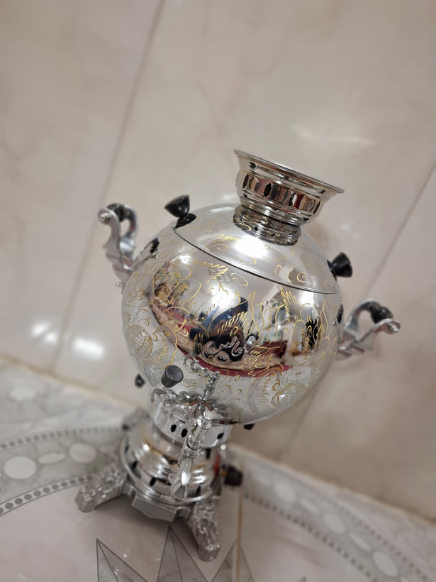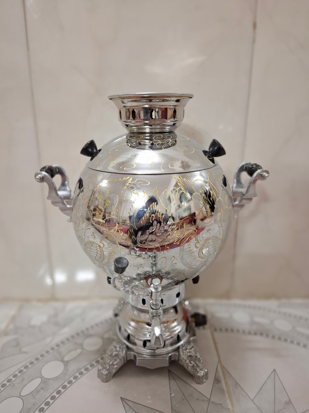 سماور گازی توپی تراش و قلم کاری 6 لیتر تنوره دار بدنه برنجی درجه یک (جدیدترین قالب) پس کرایه