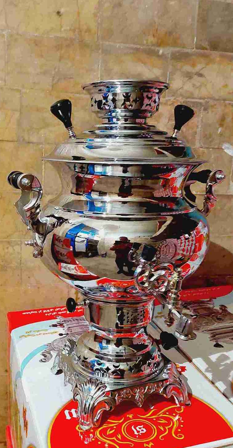 سماور گازی 6 لیتر قالب مهدیس با کوره تنوره دار بدنه برنج درجه یک ورق ضخیم با 1 سال ضمانت (طرح ساده) پس کرایه
