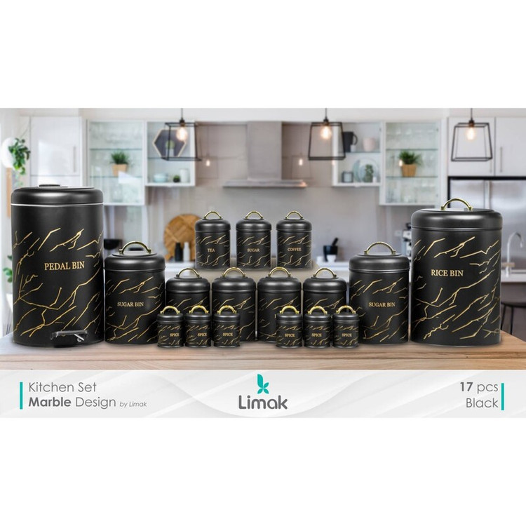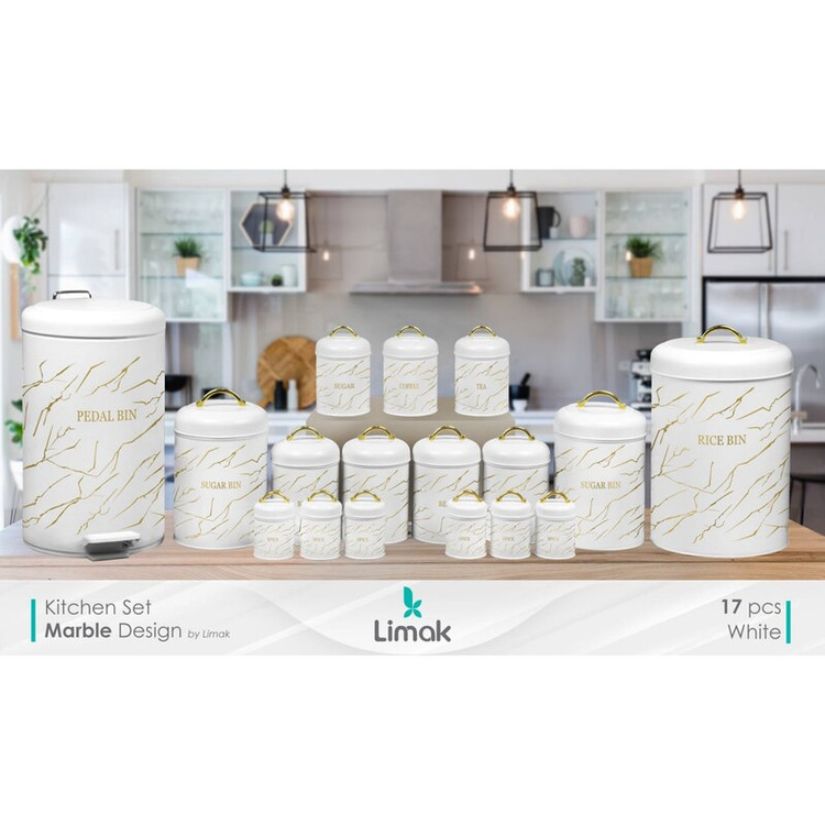 سرویس 17 پارچه فانتزی لیماک گل ماربل شامل سطل پدالی سطل برنج ظرف قند و شکر سرویس 4 پارچه حبوبات سرویس 4 پارچه پاسماوری سرویس ادویه 6 پارچه فلزی